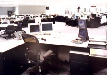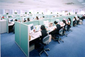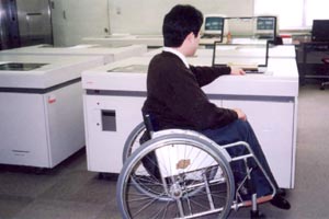 小切手帳発行作業 車椅子用に通路が広く、ゆったり取られている。フリーアクセスフロアなので配線が出ておらす、弾力性があり安全な床である |