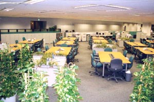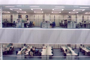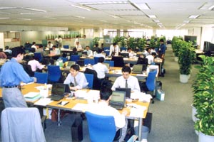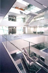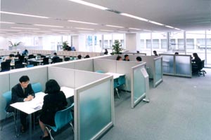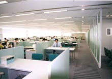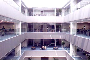| オフィスの概要 全社員1600名が、個人ホームページを持ち、かつ様々なデータベースにリンク可能なイントラネット構築が図られている。 俊敏な知的創造活動が行なえるシステムに加えて移動可能な観葉植物を間仕切りとして採用。 ワーカー自らオフィスをつくっていくフレクッス・レイアウト及びノンテリトリアル方式の開放感あるオフィスである。 | |