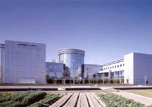 | (外観)ボリューム感のある施設を「面」と「線」 で構成し「研究所のアカデミズム」「企業の風格」「先進性」を表現 | (2階ラウンジ)リフレッシュ及び所内の飲食会にも利用できるインフォーマルな空間 |