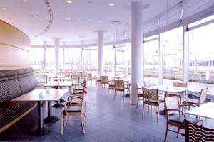 | (外観)ボリューム感のある施設を「面」と「線」 で構成し「研究所のアカデミズム」「企業の風格」「先進性」を表現 | (2階ラウンジ)リフレッシュ及び所内の飲食会にも利用できるインフォーマルな空間 |