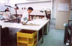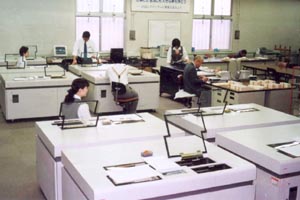 小切手帳発行作業 車椅子用に通路が広く、ゆったり取られている。フリーアクセスフロアなので配線が出ておらす、弾力性があり安全な床である |