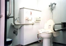 (車椅子用トイレ) 大きな操作ボタンにより手の不自由な万も取り扱い簡単で、水洗ボタンは手用と足用か用意されている |